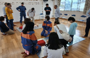 早速、グループ分けをして北名古屋市消防団第7分団「いちじく隊」のサポートの中、実施しました。人形を使用して胸骨圧迫や圧迫位置を確認しながら体重をかけて行うのですが、女性や子供にとってはかなりの力と体力が必要だと感じられました。また、意識もなく、呼吸もしていない傷病者がいた場合、救急車の要請をしながら胸骨圧迫を続けるそうです。